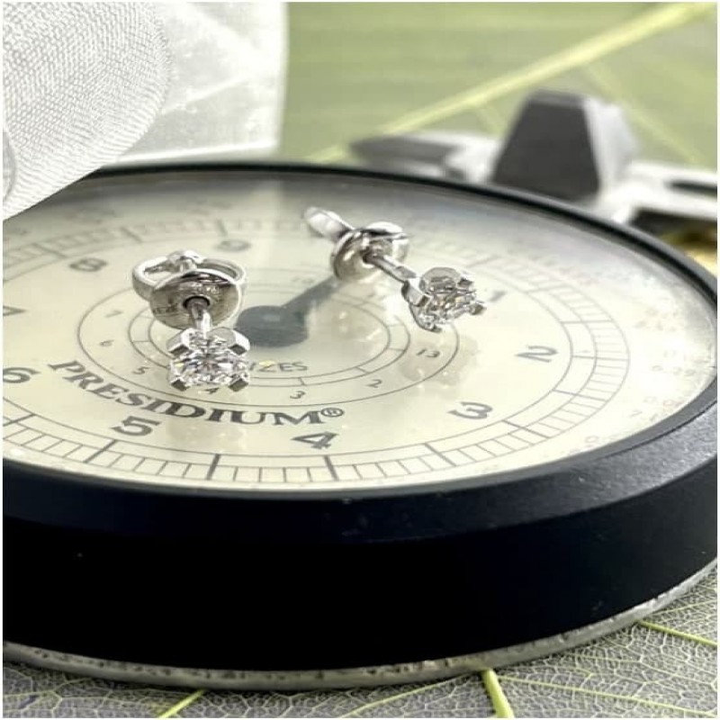 Orecchini d'oro a perno con diamanti yakutici a taglio rotondo di diametro 4,15 mm, ciascuno del peso di 0,275 carati. Orecchini quotidiani piacevoli e discreti, ma molto dignitosi, con diamanti yakutici di ottima qualità. Montatura con quattro belle griffe, chiusura piacevolmente pesante. Orecchini a perno comodi per ogni giorno, adatti anche per dormire e fare sport. Incastonatura in pietra preziosa naturale di diamante (Diamanti ALROSA, Yakutia): 2 diamanti Kr-57 0,550Ct 2/4, peso 1,92 gr.