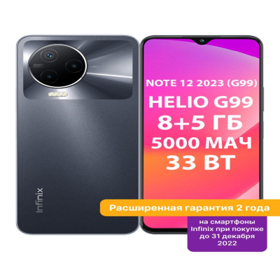 Infinix NOTE 12 2023 (G99) 8+256GB NOTE 12 2023 (G99) - PRO potenza, PRO velocità, PRO possibilità Prestazioni di punta del tuo smartphone. Processore Helio G99 6 nm Schermo AMOLED FHD+ da 6.7” Espansione della memoria fino a 13 GB Ricarica rapida 33 W Batteria da 5000 mAh Fotocamera da 50 MP Modalità speciale per la fotografia notturna Processore ad alte prestazioni Grazie al potente processore Helio G99 con frequenza di clock di 2.2 GHz, il NOTE 12 2023 (G99) offre prestazioni incredibili e assenza di throttling, indipendentemente dalle applicazioni che verranno eseguite. E grazie al processo tecnologico a 6 nm, lo smartphone si è rivelato non solo potente, ma anche energeticamente efficiente. Fino a 13 GB di RAM Espandi i 8 GB di memoria RAM nel tuo smartphone fino a 13 GB grazie all'integrazione di RAM e ROM del tuo dispositivo, il che consentirà di aumentare notevolmente le prestazioni in vari scenari. Scatti professionali La fotocamera da 50 MP con modalità speciale per la fotografia notturna ti permetterà di realizzare immagini belle e nitide anche in condizioni di scarsa illuminazione. Ricarica rapida, lunga durata La batteria da 5000 mAh ti garantirà lunghe ore di utilizzo senza ricarica, mentre l'alimentatore da 33 W permetterà di ripristinare rapidamente l'energia. Inoltre, lo smartphone garantisce fino a 800 cicli di ricarica senza alcuna degradazione della capacità della batteria.